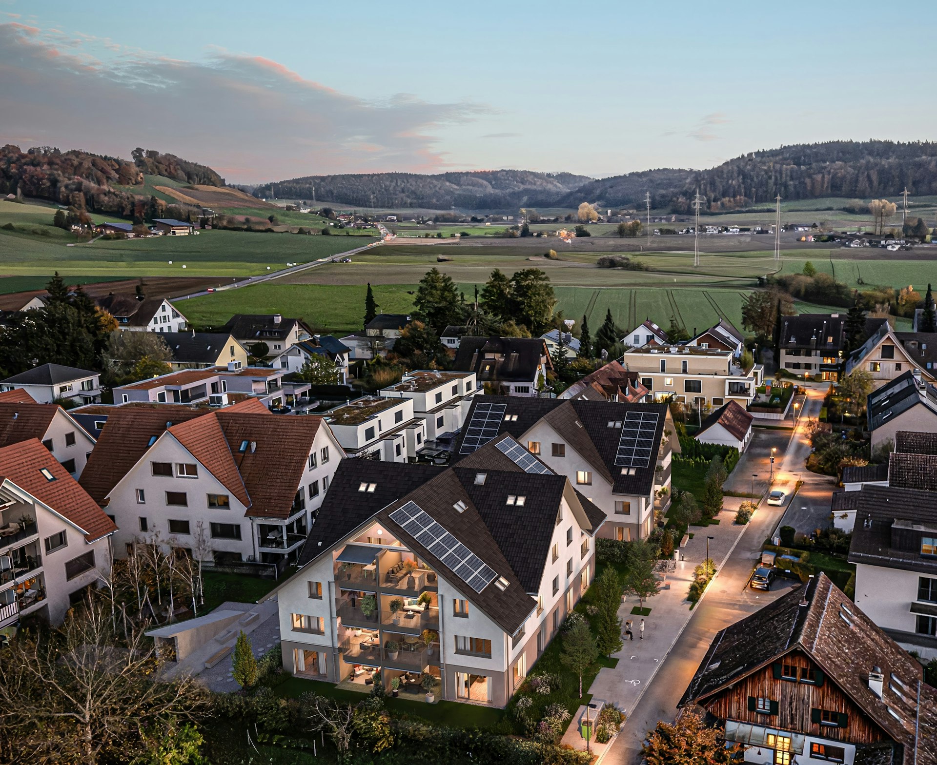 Der Wohnungsmix besteht aus grosszügig geschnittenen 1.5- bis 3.5-Zimmer-Wohnungen, welche durch ihre offenen Grundrisse und grossflächigen Fenster lichtdurchflutete Räumlichkeiten schaffen. Sie begeistern mit hochwertigen Materialien, ebenso guter Ausstattung und Blick ins Grüne. Hier finden Sie sich in einer idyllischen Wohnatmosphäre wieder, die den Stress des Alltags und der Grossstadt vergessen lässt.